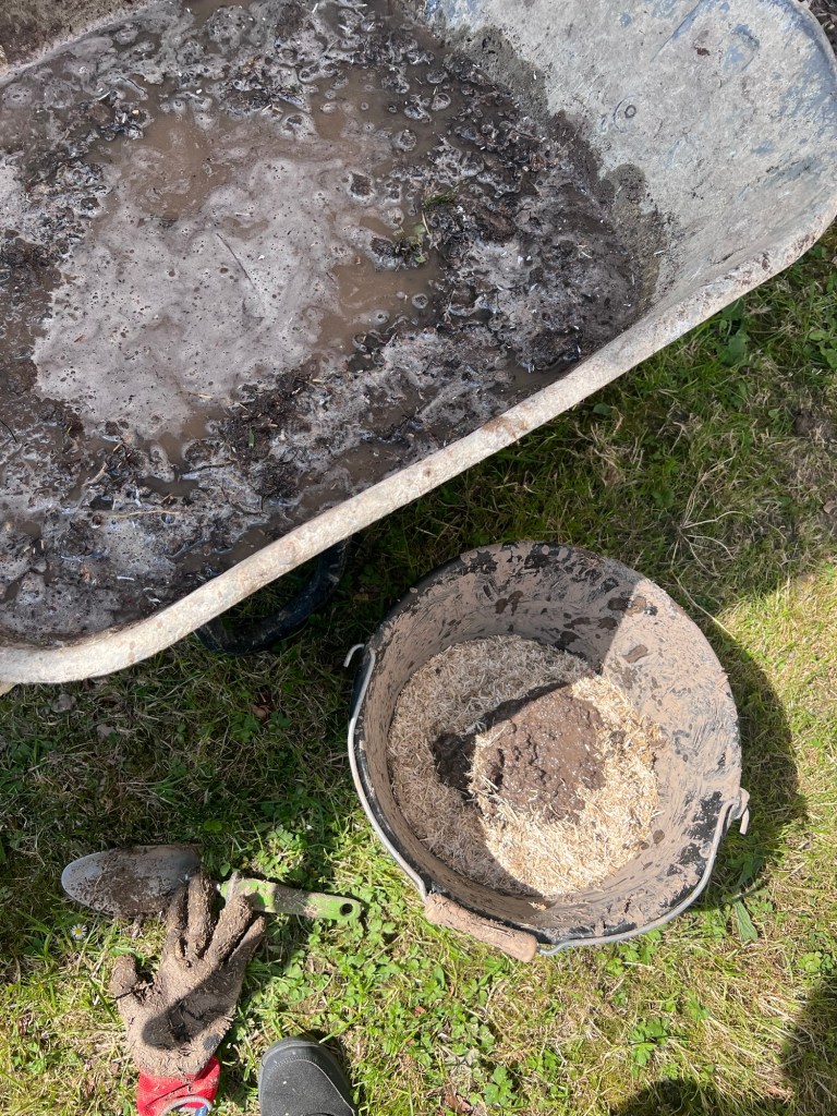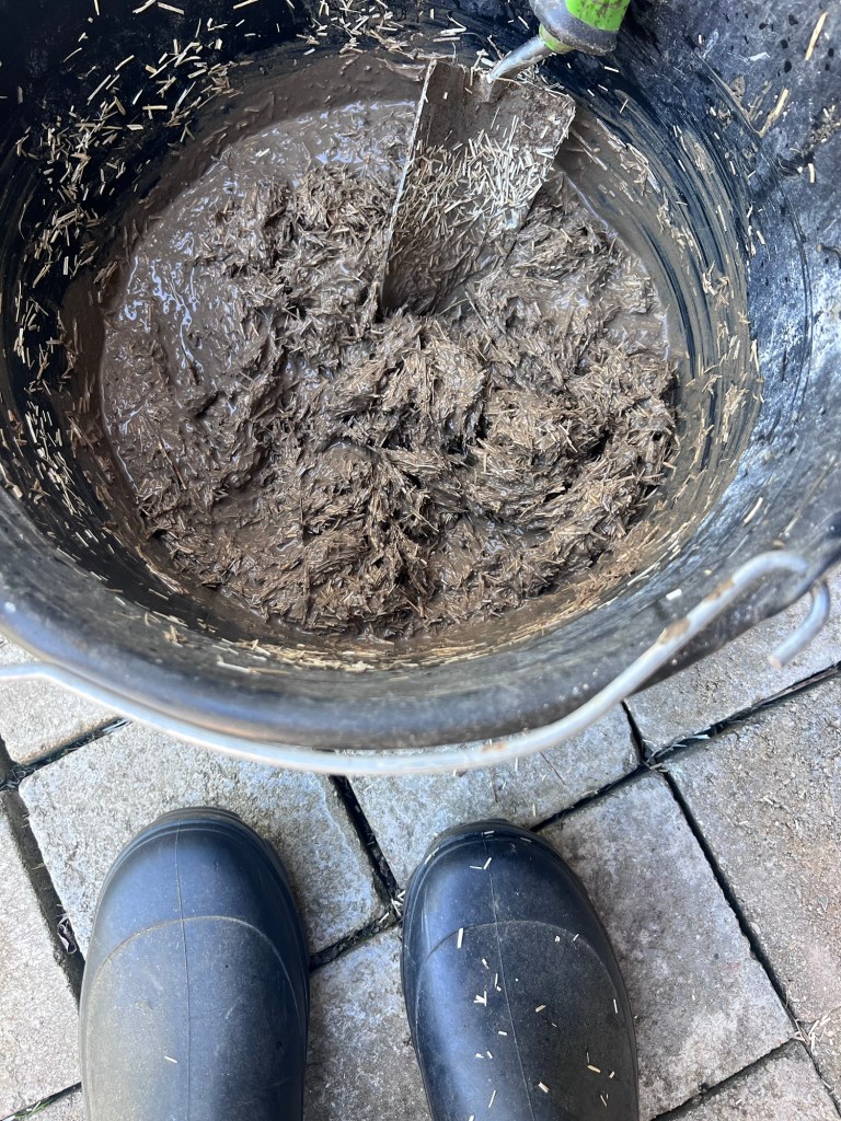 Once the clay forms a soup I added it to the cut flax. You can use hay but have to ensure it’s very fine pieces or they suggested using flax which was already in small pieces. Luckily we found a bale of flax at the garden shop.