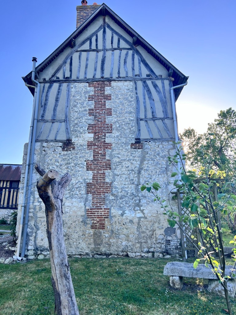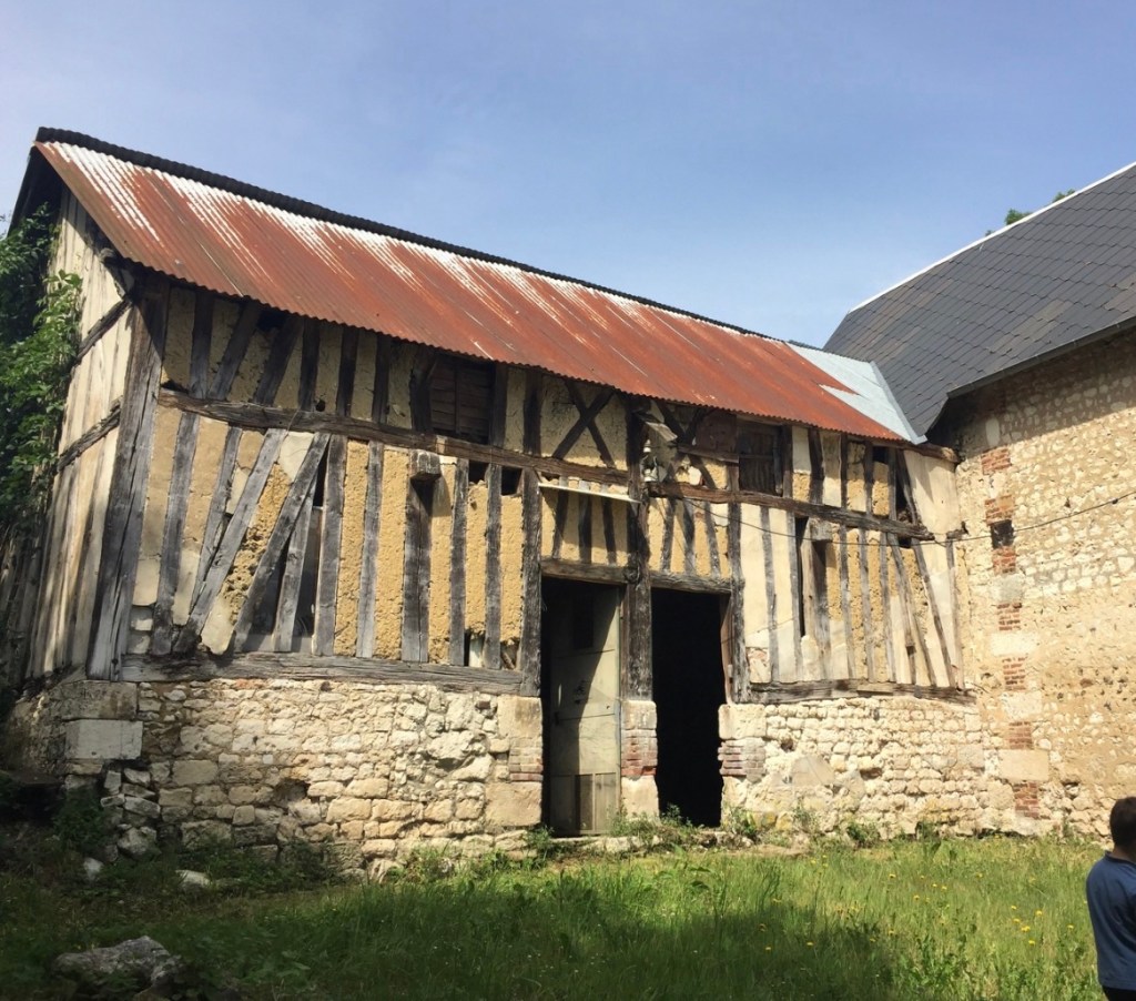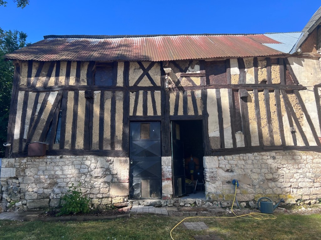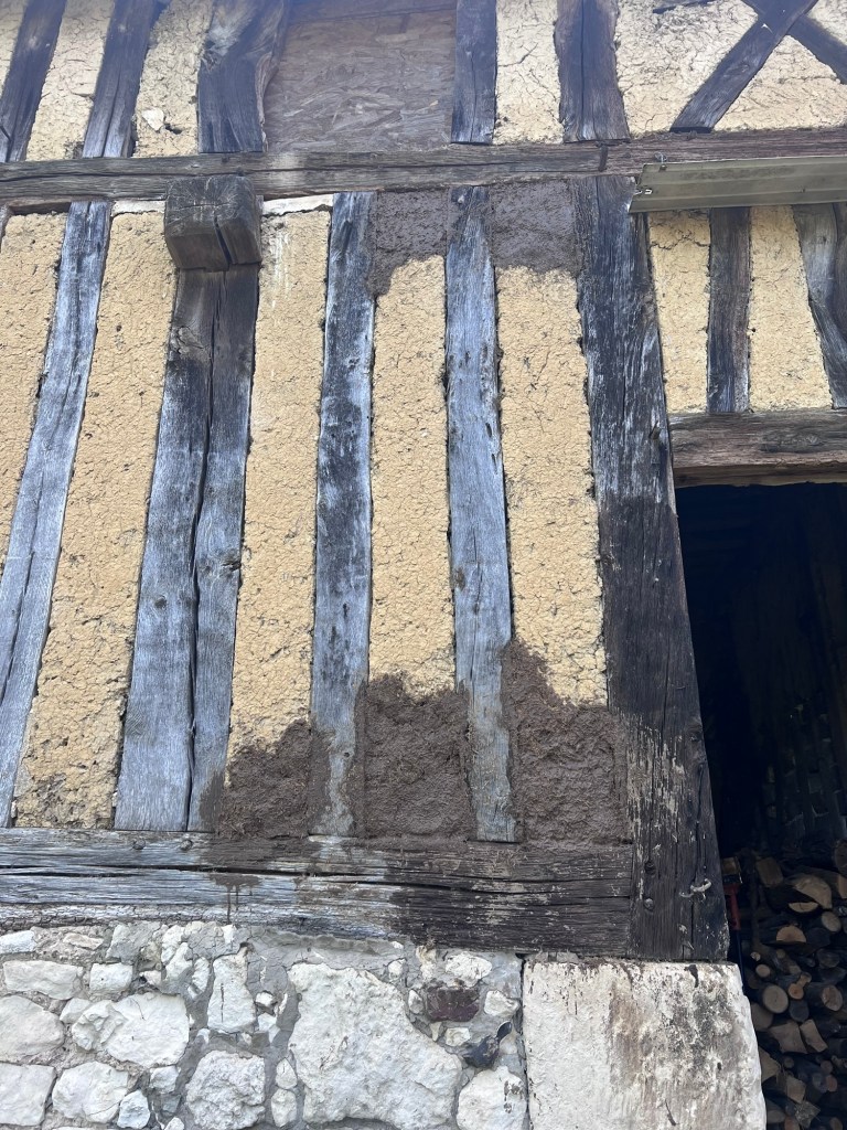 Most of the house walls are covered in plaster so you can’t see the mud and hay mix but the shed is much less maintained and you can see a collection of different styles and old fillers like bricks and wood. The mud mixture is called torchis in french. To make the torchis, first you have to dig up some clay from the garden. Then you soak it in the wheelbarrow to form a sludge.