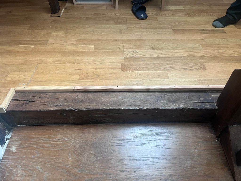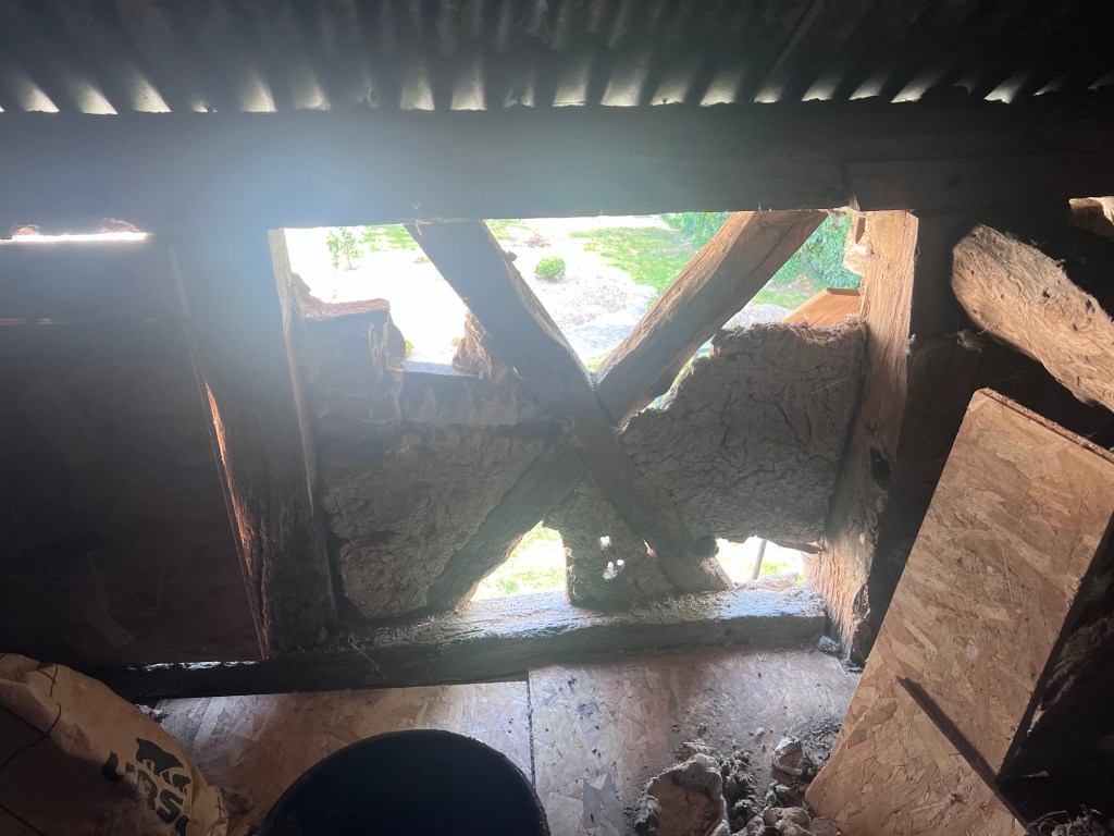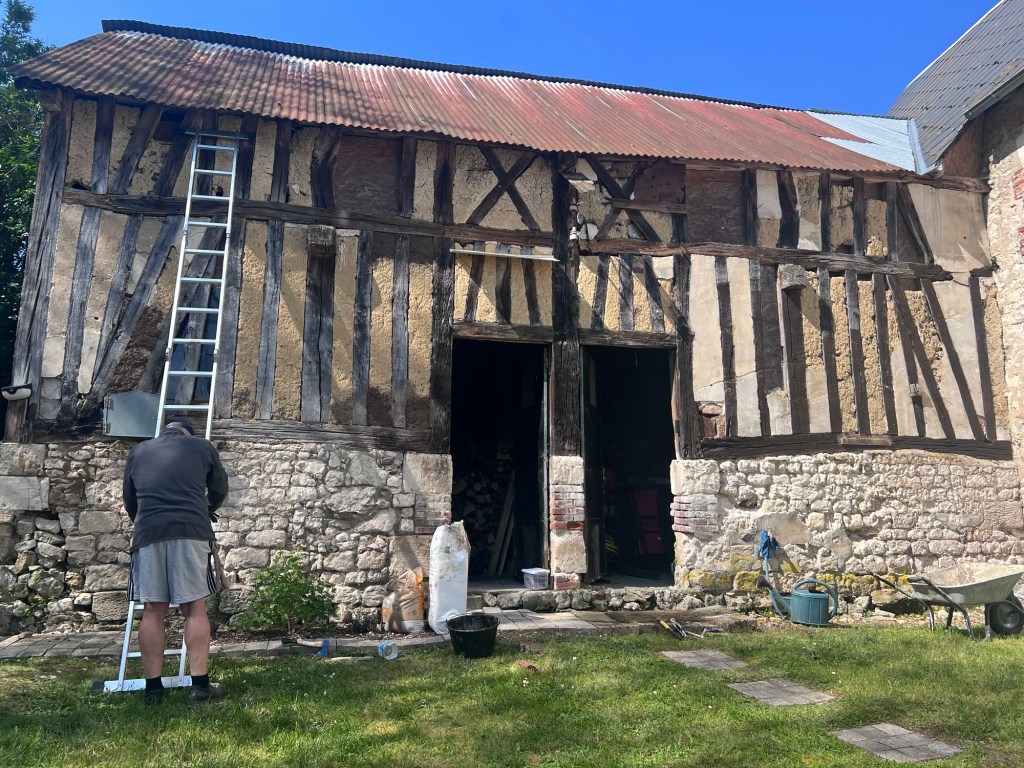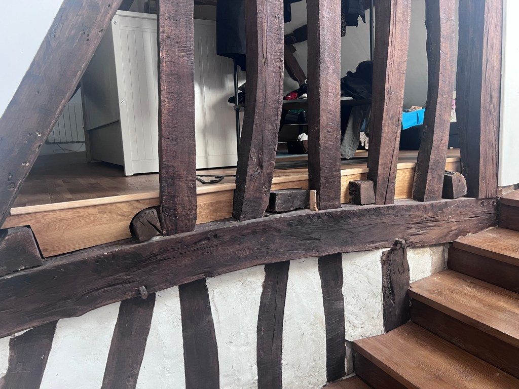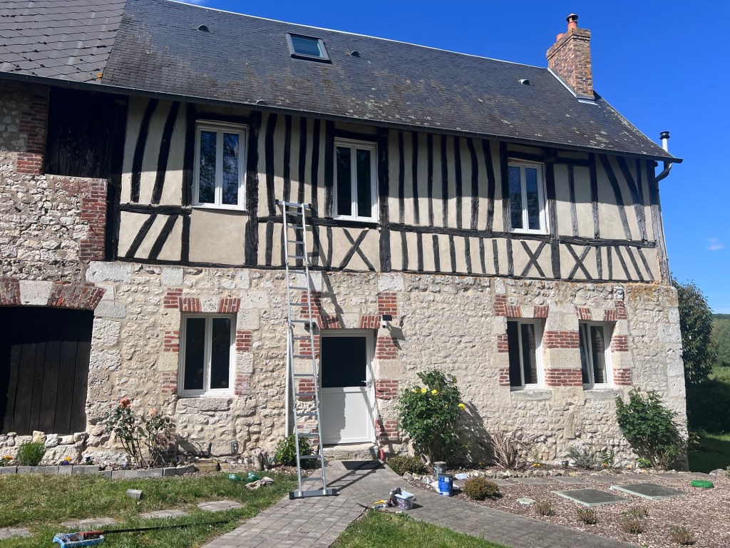We did a lot of painting to ensure all the wooden beams had a new coat of ‘dark oak’. We couldn’t do the back or left side as even with the tall new ladder we couldn’t reach.